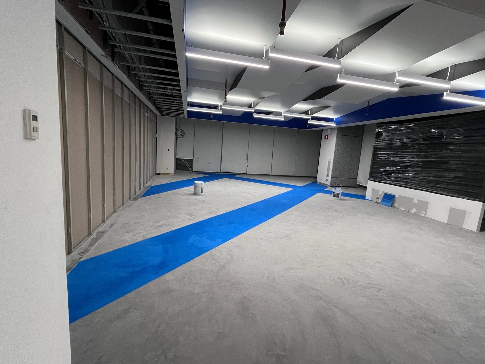 Los pisos del área de capacitación están sometidos a tránsito constante, movimientos de mobiliario, equipos y grupos de personas. Por eso, se optó por un sistema de microcemento de alta resistencia, capaz de soportar: