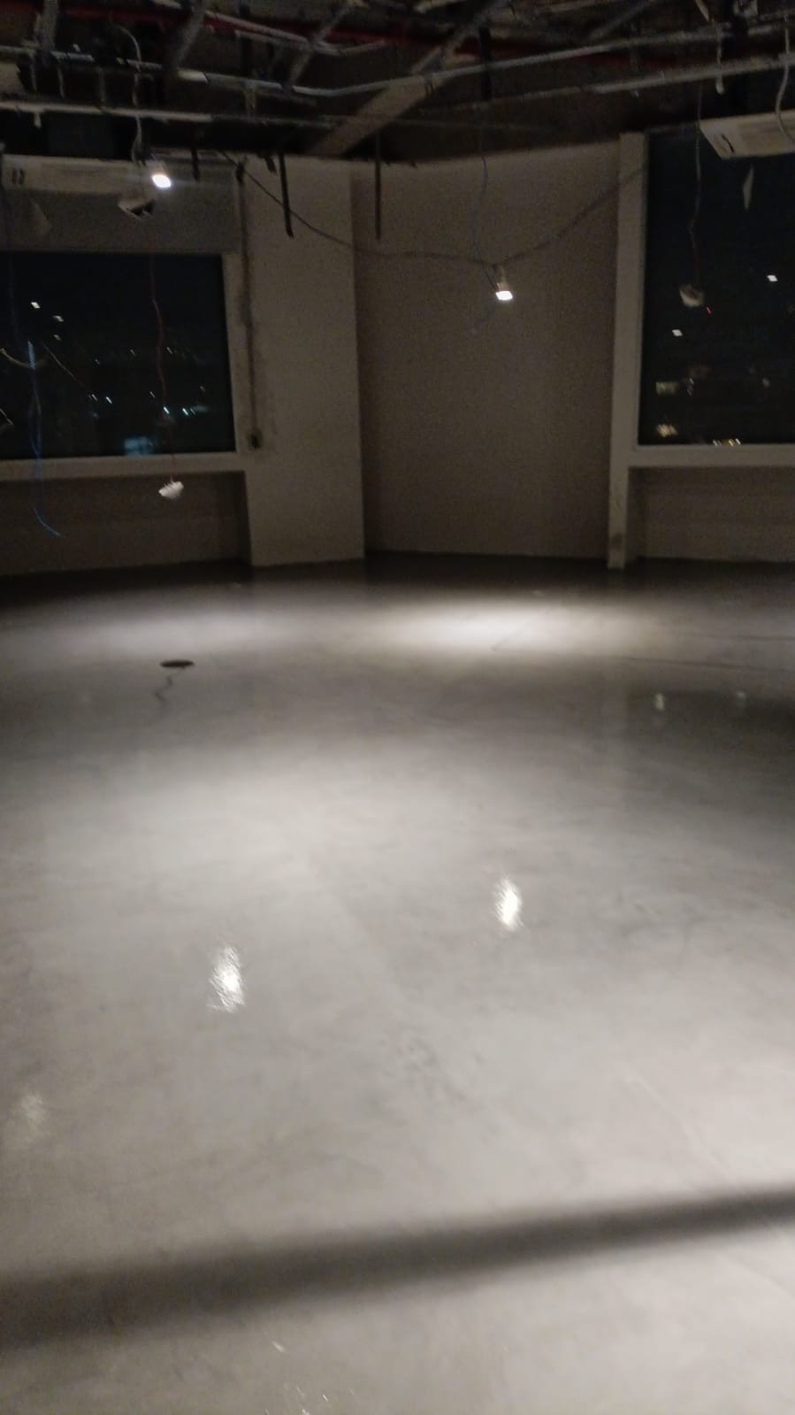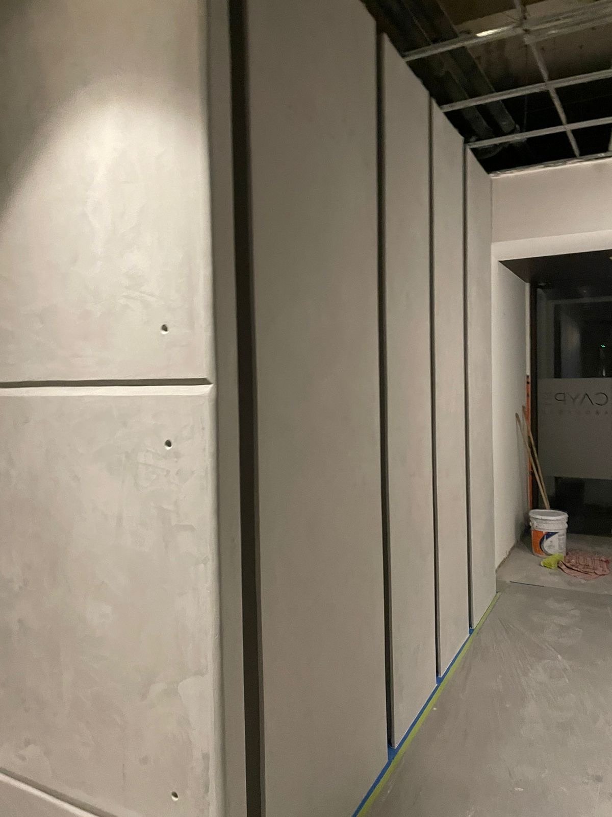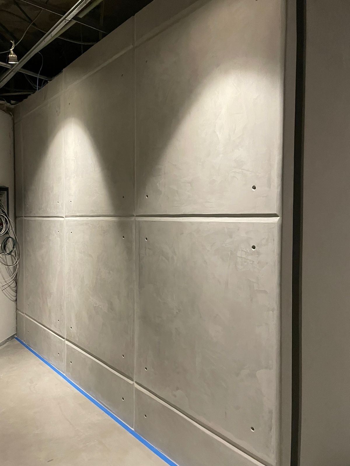 Aplicación de microcemento en pisos, creando una superficie continua que complementa la propuesta artística y sensorial del espacio. Un acabado moderno y resistente, ideal para alto tránsito y diseño vanguardista.