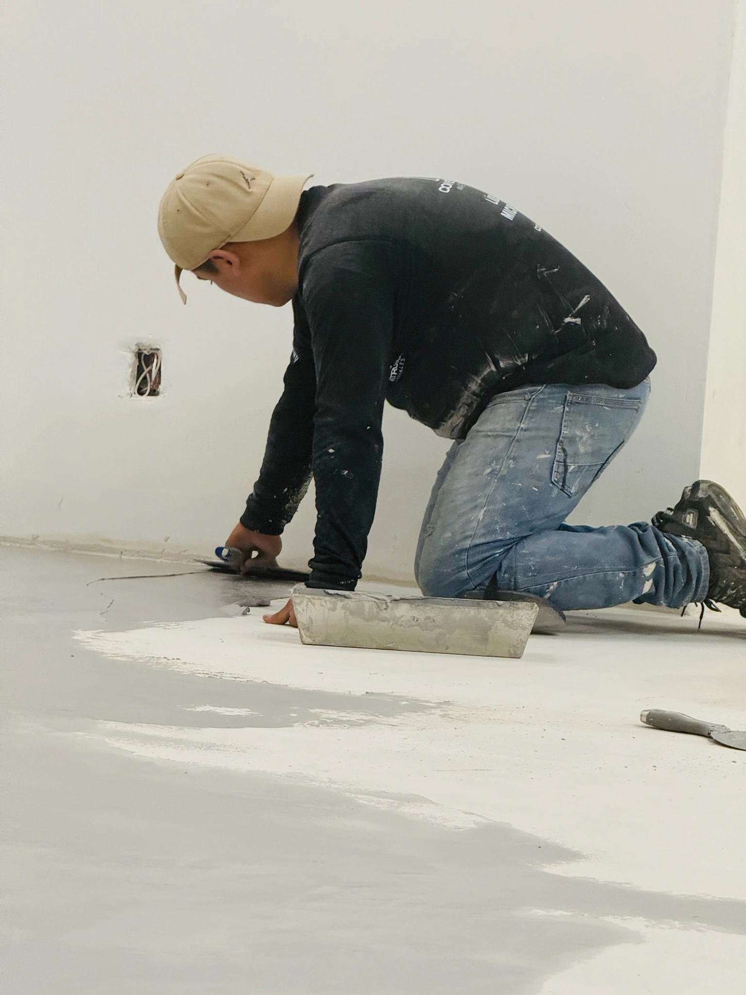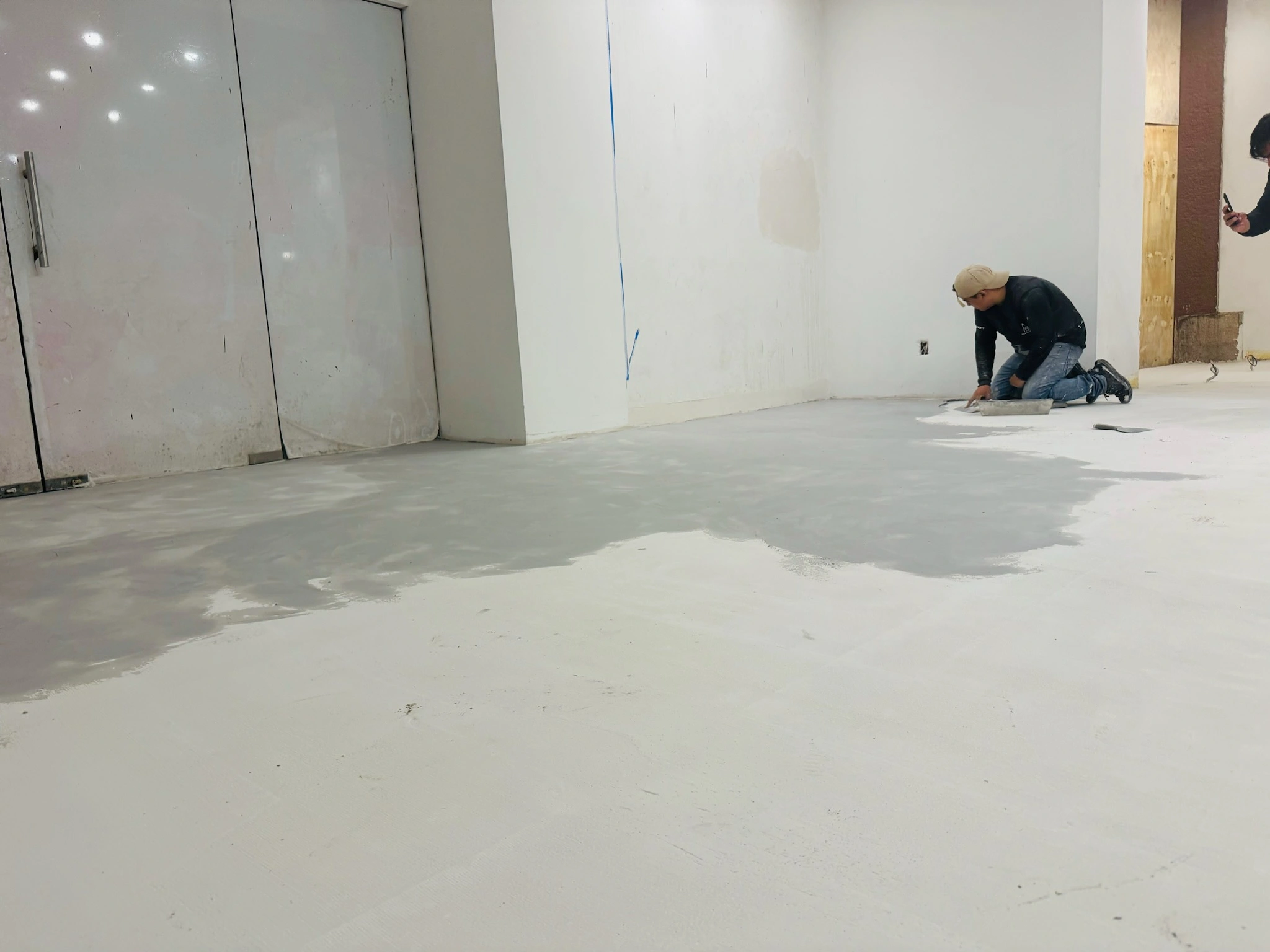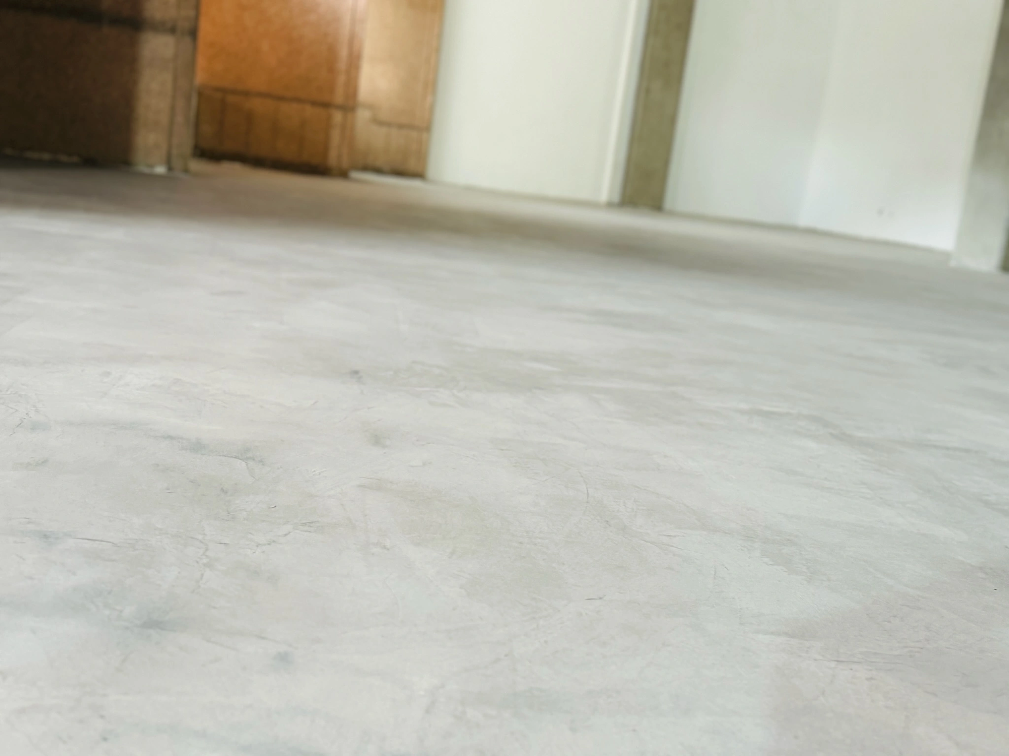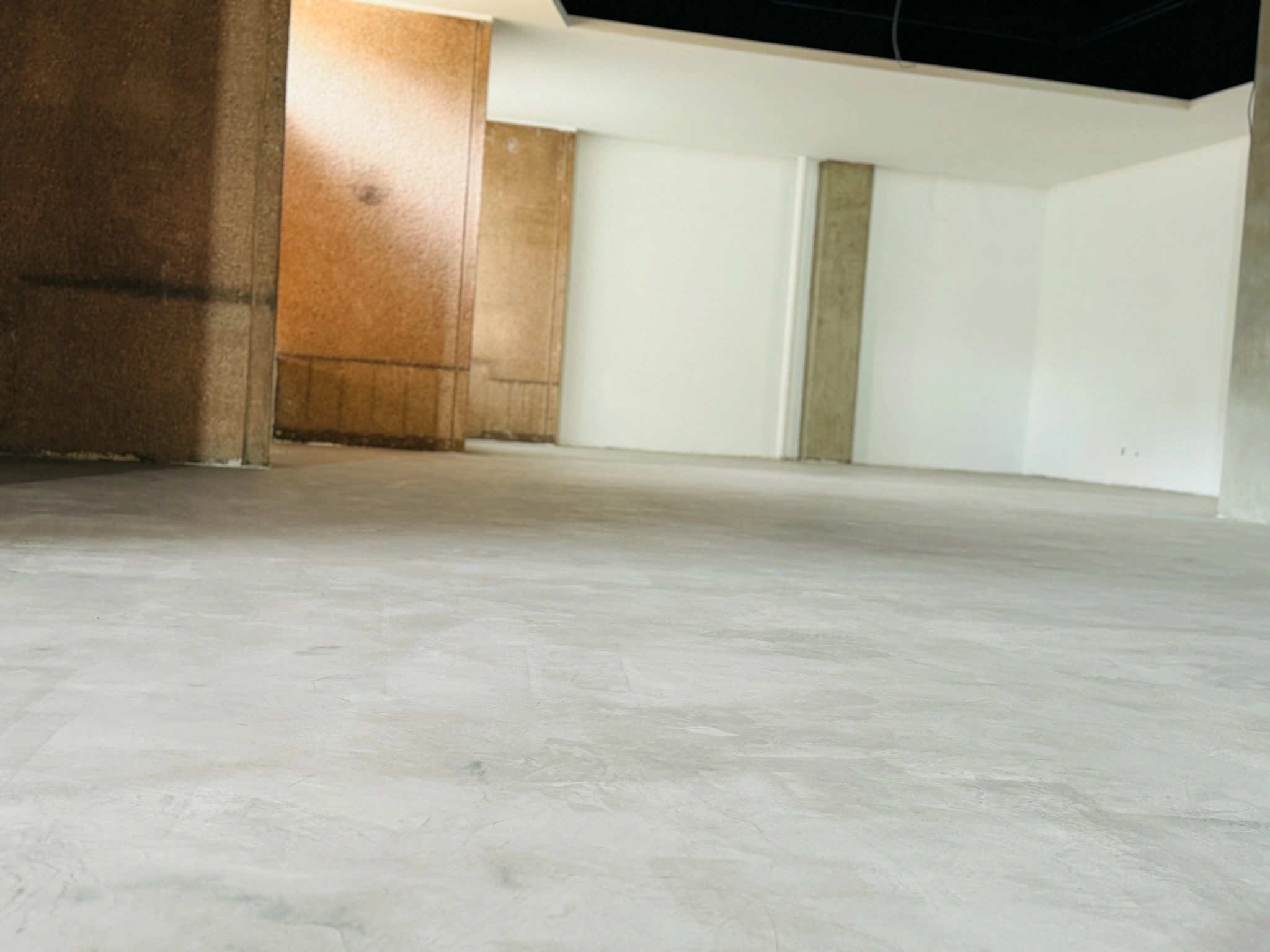 Aplicación de microcemento en pisos, creando una superficie continua que complementa la propuesta artística y sensorial del espacio. Un acabado moderno y resistente, ideal para alto tránsito y diseño vanguardista.
