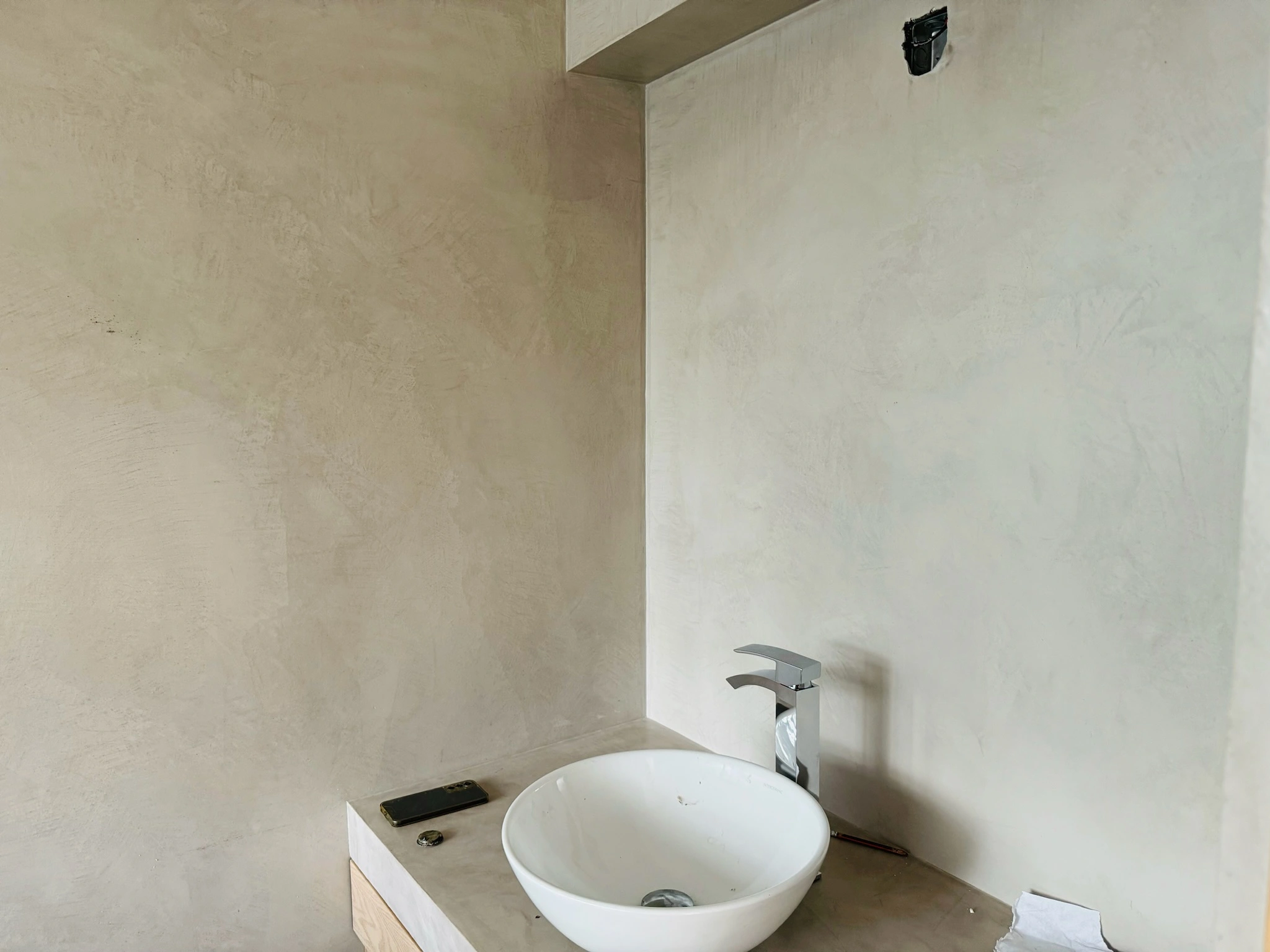 El microcemento aplicado otorga superficies sin juntas, que maximizan la sensación de amplitud y facilitan la limpieza diaria. Además, su alta adherencia permitió trabajar sobre distintos materiales existentes sin necesidad de retirar revestimientos previos, optimizando los tiempos de obra y reduciendo costos de intervención.